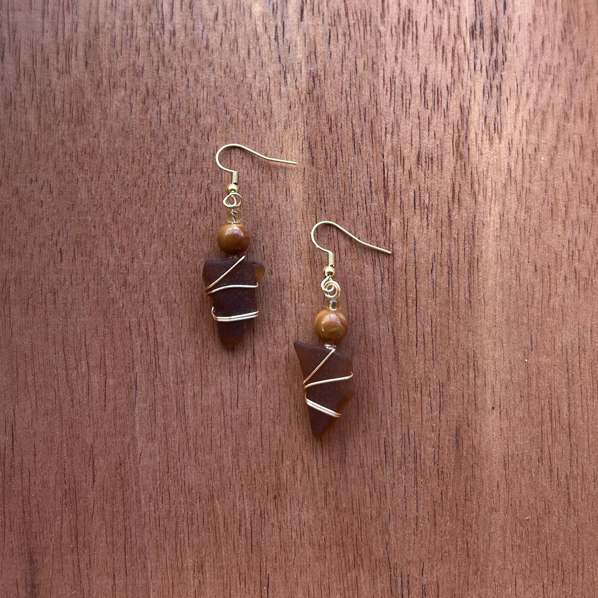 Pendientes bañados en oro de 18 quilates con cristales de mar marrones y cuentas vintage.