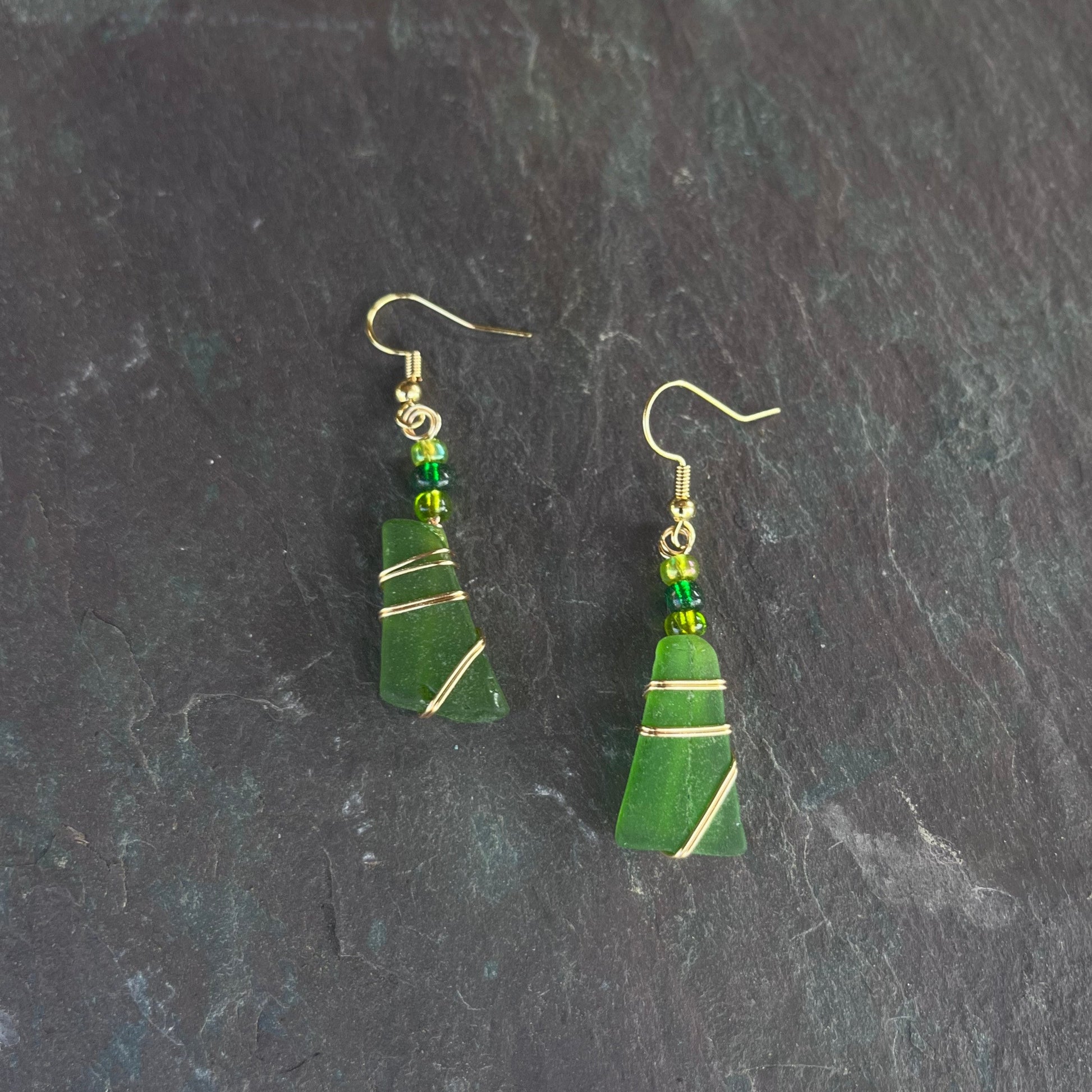 18K gold plated earrings with green seaglass and green and gold beads.